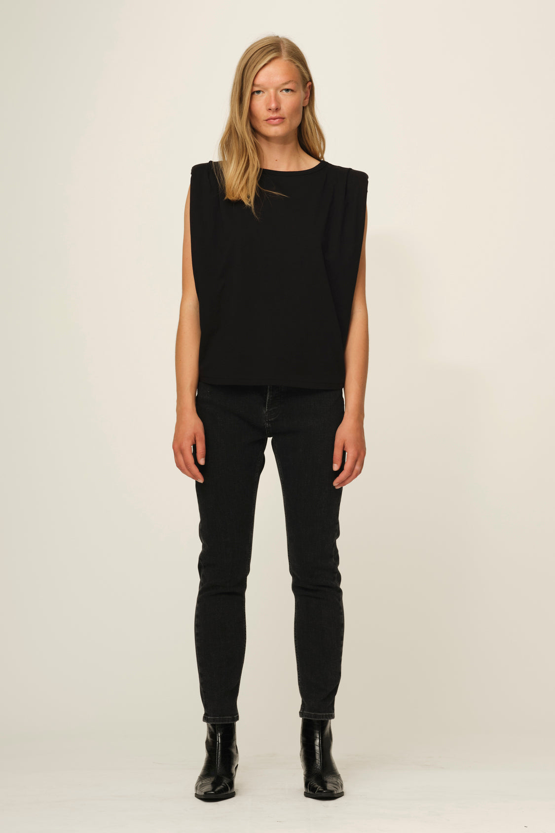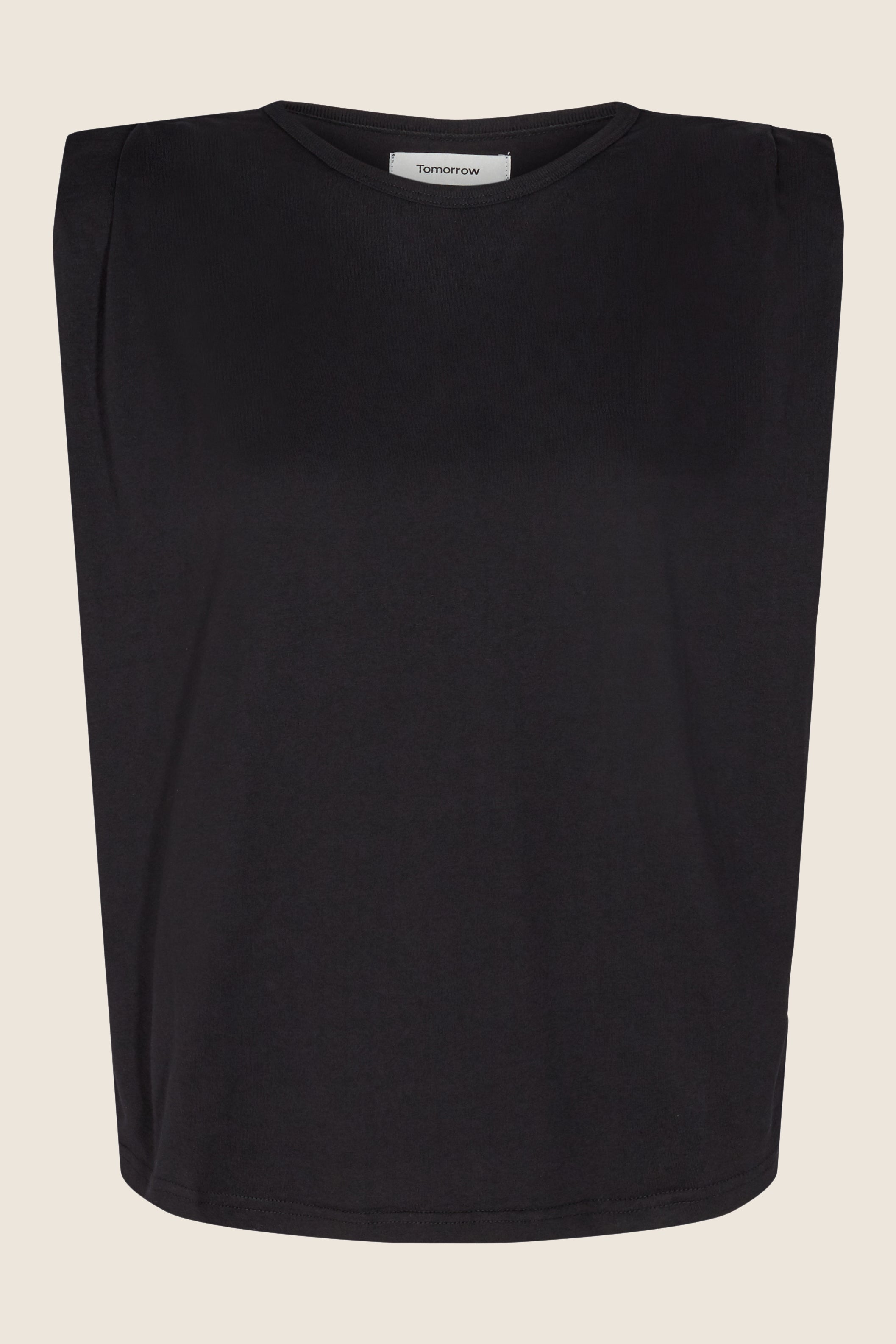 This shoulder tee is made from soft light weight cotton-jersey which gives a natural drape for the padded shoulders and boxy shape.