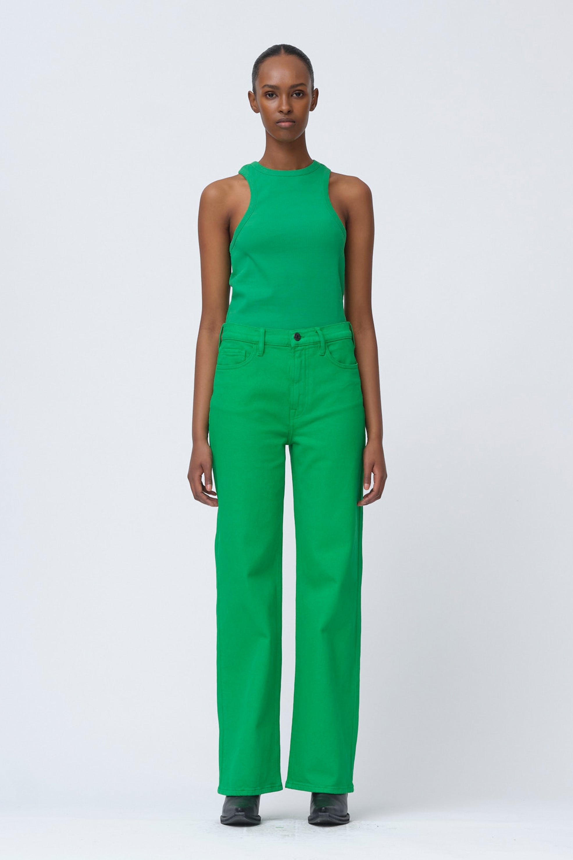 These 5-pocket jeans with high waist are fitted loose around hips and thighs with a wide leg. Comes with tone in tone stitches for a clean look.