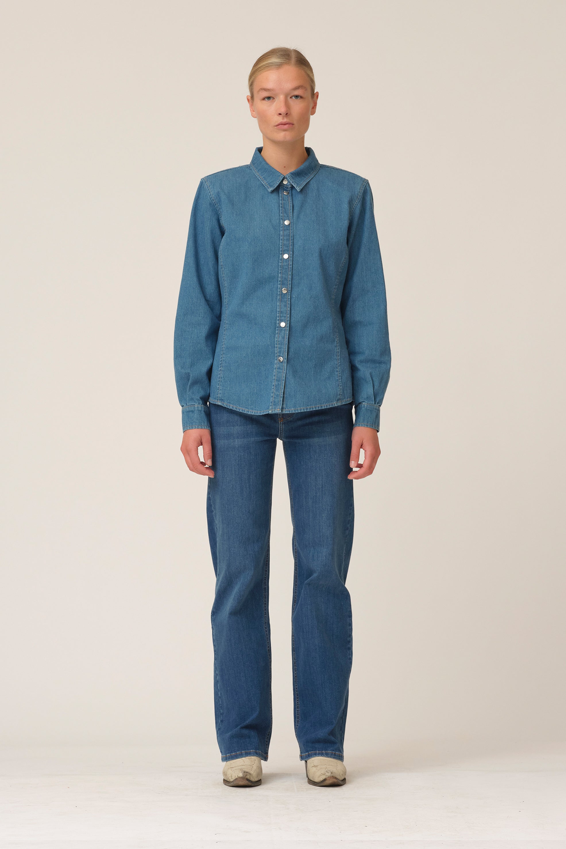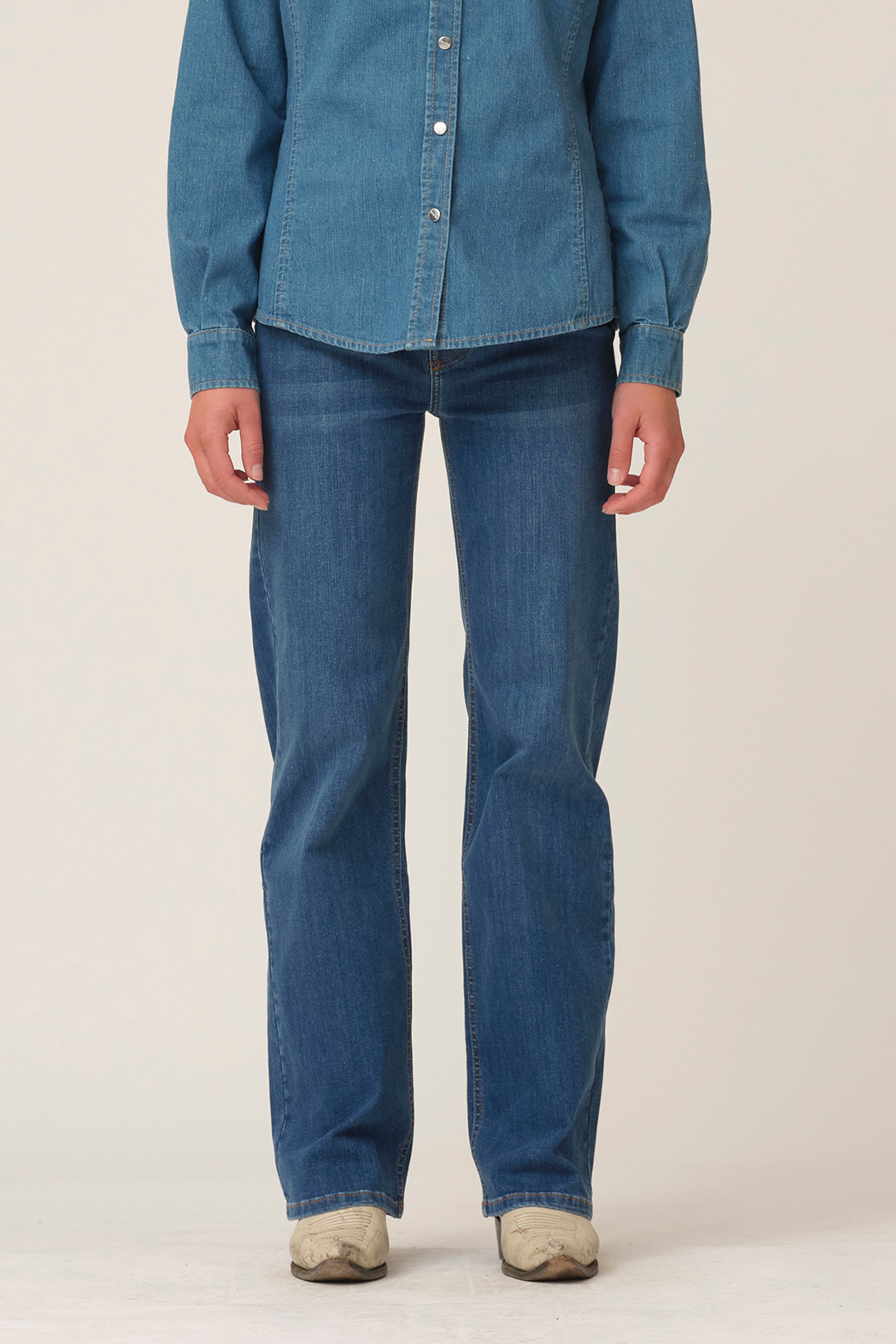 These 5-pocket jeans with high waist are fitted loose around hips and thighs with a wide leg. Washed i a mid blue denim.